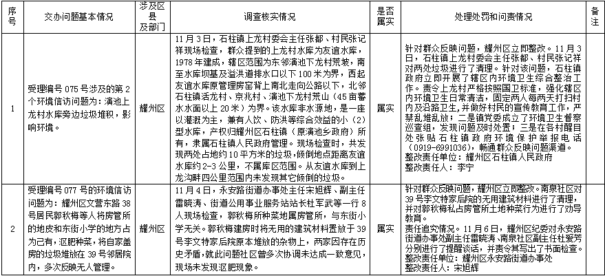 2017年11月3日,省委环境保护督察组交办涉及铜川市环境信访件3件,其中涉及耀州区环境信访件2件,现将第21批交办问题办理结果通报如下: