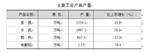 在统计的13种主要产品中,能源、建材等9种产品生产实现持续增长,其中原煤产量达1259.1万吨,同比增长10.9%;水泥1997.1万吨,同比增长28.0%。
