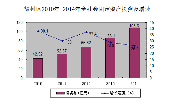 全年全社会固定资产投资完成108.6亿元,增长26.2%;其中,固定资产投资完成96.9亿元,跨地区投资10.6亿元,农户投资1.1亿元。从三大产业来看,第一产业投资13亿元,增长97.6%;第二产业投资40.2亿元,增长18.3%;第三产业投资55.4亿元,增长21.7%。一、二、三产业投资占投资的比重分别为12%、37%和51%。