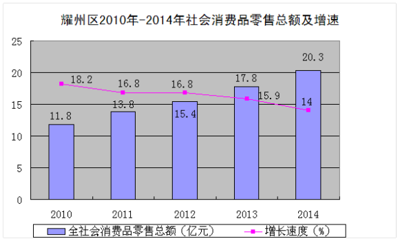 全区实现社会消费品零售总额20.32亿元,增长14.0%。分城乡看,城市实现零售额14.93亿元,增长13.4%;农村实现零售额5.39亿元,增长15.6%。分行业看,批发零售业实现零售额17.13亿元,增长14.4%,住宿餐饮业实现零售额3.19亿元,增长11.6%。按企业规模划分,限额以上企业实现零售额6.43亿元,同比增长22.0%,占全社会消费品零售额比重31.6%;限额以下商贸企业实现零售额13.89亿元,同比增长10.2 %,占全区社会消费品零售额比重68.4%。