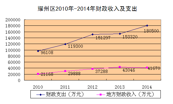全区财政总收入完成14.56亿元,同口径增长12.6%;其中,地方财政收入4.17亿元,同口径增长8.53%。全年财政支出18.05亿元,增长 17.7%。其中,教育支出44949万元,增长10.5%;科学技术支出1251万元,增长39.5%;文化体育与传媒支出7017万元,增长8.7%;社会保障和就业支出19164万元,增长2.7%;医疗卫生支出21173万元,增长48.9%;农林水事务支出38135万元,增长5.4%;环境保护支出6746万元,增长22.3%。