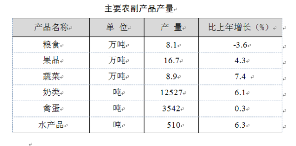 全年粮食播种面积41万亩,粮食总产达8.1万吨,同比下降3.6%;蔬菜总产8.9万吨,同比增长7.4%。全年新栽鲜干果1.6万亩,果品总产量16.7万吨,同比增长4.3%,其中苹果15.6万吨,增长3.44%。新栽中药材6100亩,栽植油用牡丹3250亩。畜牧业发展良好,猪、牛、羊出栏分别达到2.4万头、1.3万头和2.6万头,分别增长8.3%、2.1 %和7.8%;肉类总产量3933吨,奶类产量12527吨,禽蛋产量3542吨。